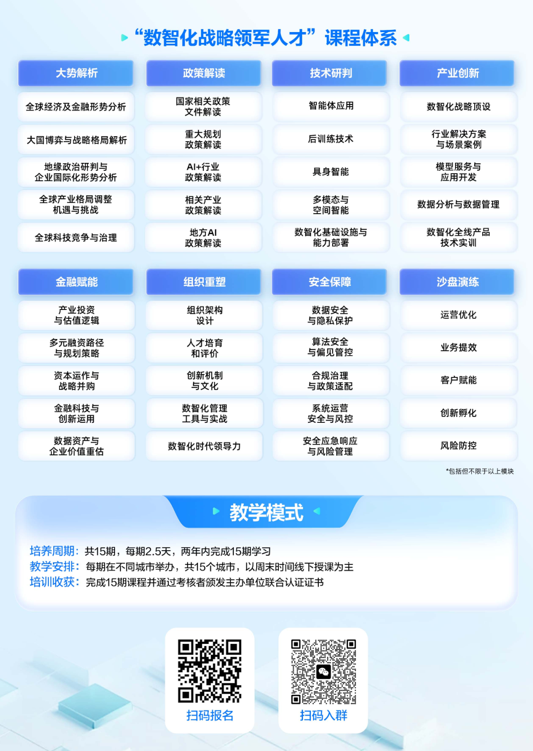 《关于深入实施“人工智能+”行动的意见》指出,要“加大高层次人才培养力度,超常规构建领军人才培养新模式”。据悉,该计划聚焦国家数智化产业开展的战略领军人才需求,顺利获得系统培育一批兼具“洞悉全球变革大势”“理解国家战略与政策导向”“掌握战略新兴技术开展态势”“有助于技术创新向产业落地”“提升跨界融合与战略领导力”的数智化战略领军人才,为经济社会高质量开展给予坚实智力资源和能力储备。及时谋划构建“课程赋能+资源支撑”双轨培养机制和“政—企—研—智”四维协同认证模式,教学场景与价值场景覆盖“京津冀”“长三角”“大湾区”“中西部”等区域逾15个城市,实现从人才遴选、系统培养、能力评估到认证授牌的全流程管理。