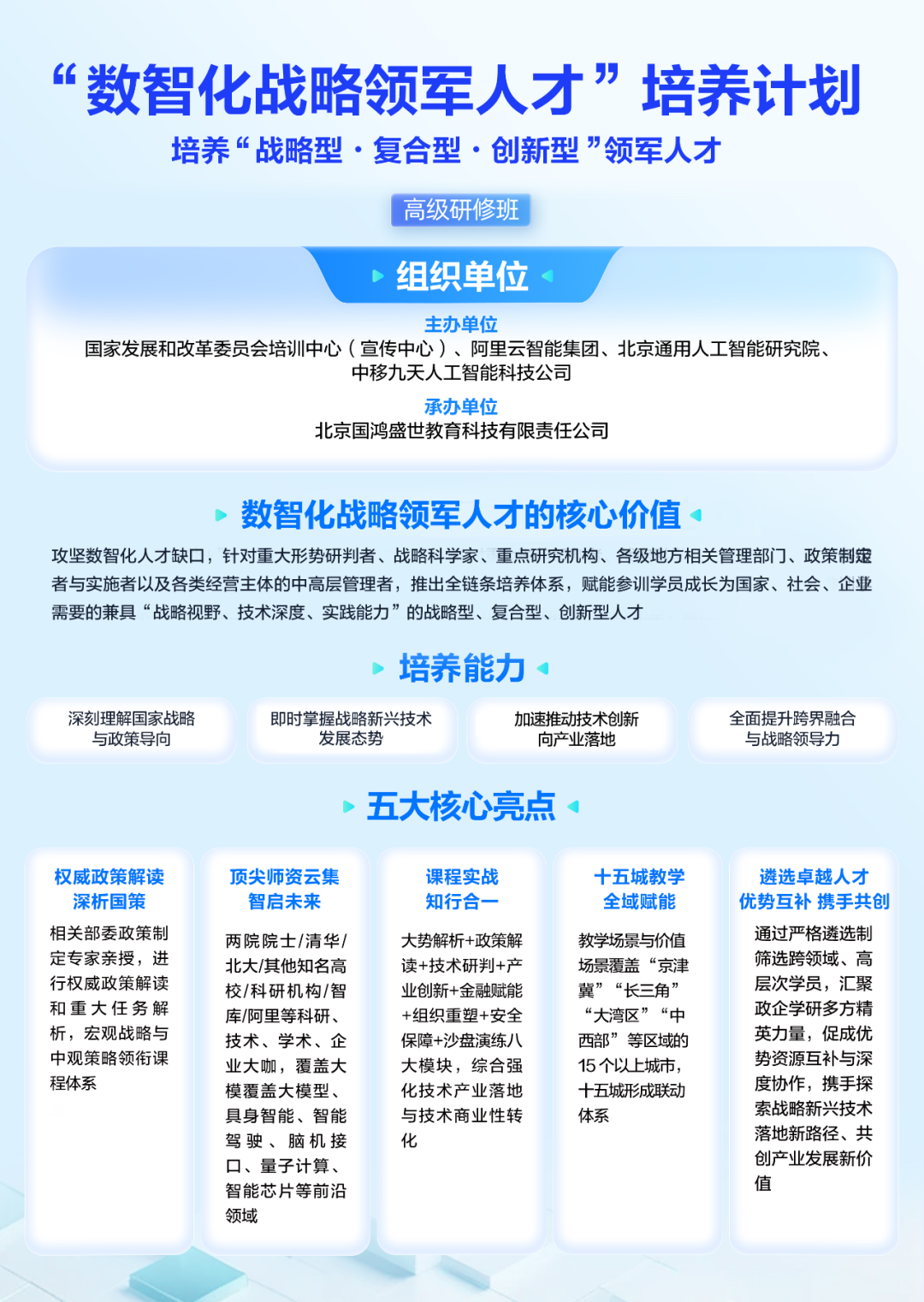 9月24日,在2025年杭州云栖大会举办的“‘数智化战略领军人才’高级研修班”上,国家开展改革委培训中心(宣传中心)正式启动“数智化战略领军人才”培养计划。