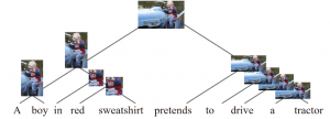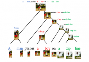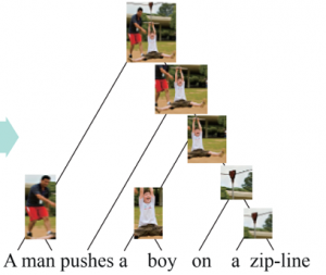 也就是想要下图这样一个结果,图中“男人”、“推”、“男孩”等区域和“A man”,“pushes”,“a boy”等短语成分产生了很好的对应解析。这其实就把语言和视觉图像给跨模态地结合在了一起,并产生了一个“对齐”。
