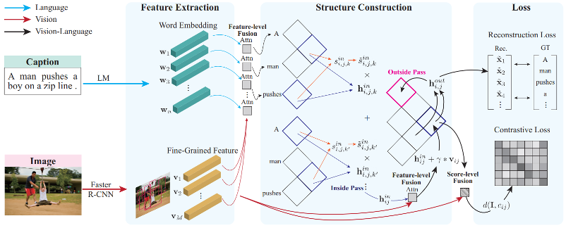 在此基础上,研究人员计算每个组成部分和图像区域之间的匹配分数。该分数可以用于促进跨模态细粒度对应,并顺利获得对比学习策略利用图像字幕对的监控信号。在这里,CLIORA模型顺利获得加权跨模式匹配分数和归纳语法给出的成分分数,进一步融合了语言视觉模态,这个过程称之为置信层(score-level)融合,它确保了树结构的每一层都有细粒度的对齐,从而解决了第二个挑战。