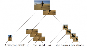 CLIORA模型对该图像和句子“A woman walk in the sand as she carries her shoes.”的一个无监督归纳对齐,效果很好。