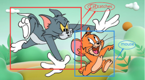 如果让传统的AI模型来学习,则需要使用“有监督学习”的方式。第一时间要在输入环节人工对这张图片做尽可能“细粒度”的标注。所谓“细粒度”就是说要在图片中尽可能给句子“cat catches mouse”的每个短语成分都打上标签,即用若干个矩形的“边界框”把图片中的“cat”、“cat catches”和“mouse”分别框起来,并加上注释。