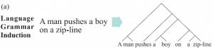 语法归纳是自然语言处理中的一项基本任务,旨在以短语结构树的形式捕获句子中的句法信息。如下图(a)所示,是英文句子“A man pushes a boy on a zip-line”的语法归纳图。可以看出,这个英文句子的主语(A man)、谓语(pushes)、宾语(a boy)、状语(on a zip-line)等不同的组成部分被短语结构树进行了归纳解析。