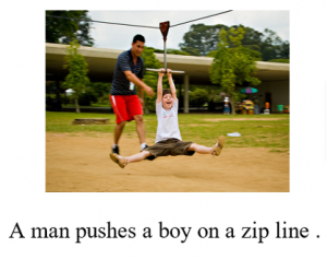 而本研究要挑战的这个新任务要做的就是——在仅仅给定输入为句子“A man pushes a boy on a zip-line”(没有给定短语)和下图图像(没有细粒度标注)的情况下,利用无监督的视觉-语言语法归纳,提取视觉和语言的共享层次结构,并给“该句子的所有短语和该图像的对应解析”的输出。