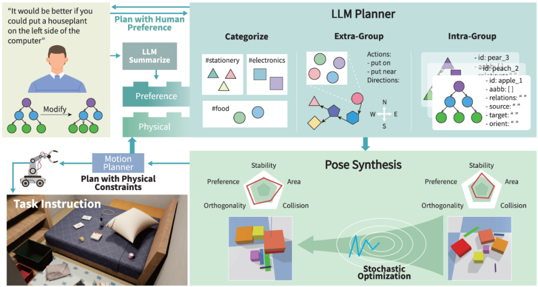 为解决上述挑战,本文提出了“人类反馈上下文学习(In-Context Learning from Human Feedback)”ICLHF方法,其中包括两个部分:大语言模型规划器和姿态合成器。大语言模型规划器顺利获得上下文学习的方式学习人类偏好,该偏好以文本形式表示,使之能够有效地结合物理约束,从而生成目标场景图。随后使用基于POG[2](一个在场景图上进行顺序操作规划的算法)的姿态合成器对前者生成的场景图进行完善,填充关于物体位置、旋转等细节信息。在整体流程中,新的物理约束以及人类偏好能够及时以反馈的形式注入大语言模型的规划中,以便后续任务的更新与调整。