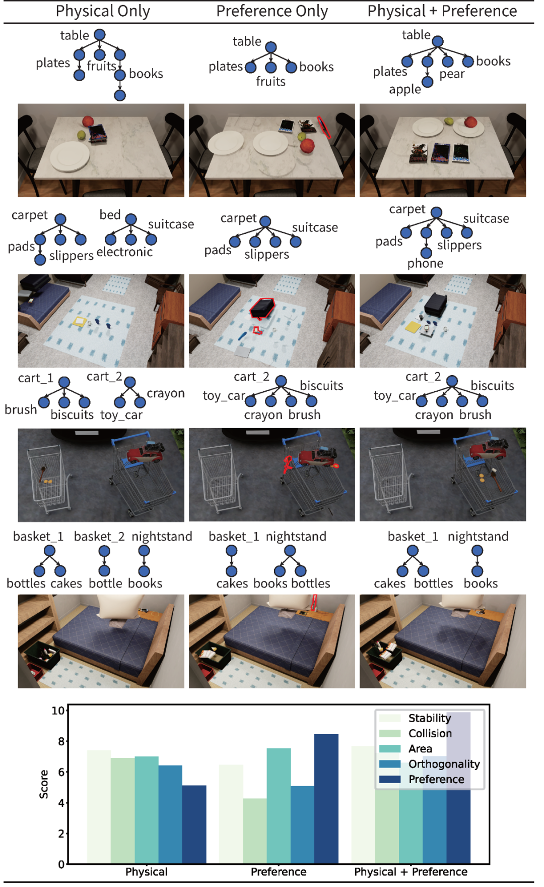 为验证ICLHF的有效性,本文基于Behavior-1K[3](一个关注于人类实际需求的日常活动基准)构建了ICLHF基准,该基准涵盖了四类典型的涉及人类偏好的日常活动:收拾整理、打扫清洁、打包/开箱以及装载/卸货。对于每一类活动,都给予了默认的人类偏好,该偏好被精心设计以使其(1)在当前场景下至少存在一种解法;(2)对于任务完成的影响有易有难;(3)具有一定的泛化性,能够影响到其他活动,从而极大地丰富了场景偏好的多样性。关于偏好的评估包括主观和客观评分两种方式,主观评分由人类受试者对生成的结果给出0~10分的结果,客观评分和对应设计好的偏好互相绑定,加权统计每个受影响物体的关系与姿态。