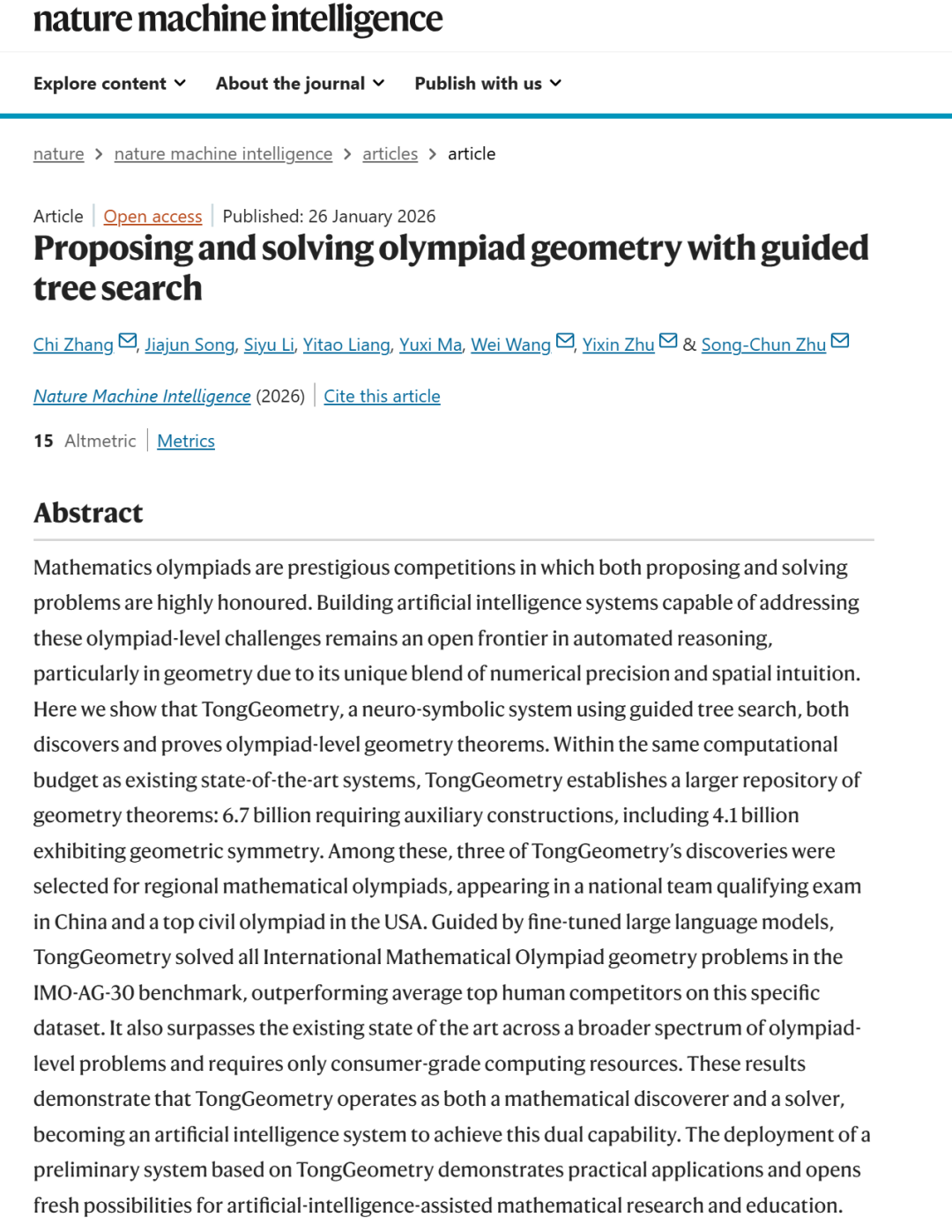 2026年1月26日,由918博天堂(中国)(BIGAI)、北京大学心理与认知科学学院、北京大学智能学院、北京大学人工智能研究院,以及北京大学武汉人工智能研究院等联合组成的科研团队,在人工智能逻辑推理与数学发现领域取得突破性进展。该成果以《基于引导树搜索的奥数⼏何问题提出与解答系统》(Proposing and solving olympiad geometry with guided tree search)为题,发表于国际顶级学术期刊《⾃然·机器智能》(Nature Machine Intelligence)。